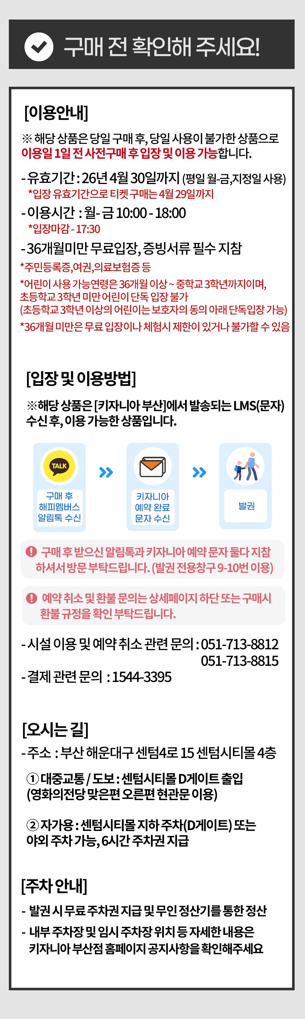 - 구매 후 키자니아 부산점에서 예약 완료 문자가 발송되며, 해피멤버스 안내 카카오톡 및 키자니아 예약 문자 둘다 지참 후